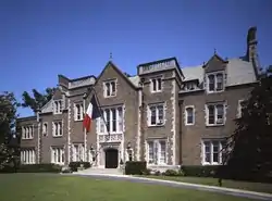 It is the largest single-family home in the Kalorama neighborhood;[11] a 1980 guidebook published by Smithsonian Institution Press describes the home's setting as "a dramatic and beautiful site high above Rock Creek."[12] Constructed of brick and limestone, the mansion house is described in National Register of Historic Places papers as an "imposing structure" with irregular massing, with its most prominent feature being a "dominant entry bay with large gables is anchored by two flanking square towers, each capped by a stone balustrade."[11] Its architectural style has been variously described as Tudor Revival[3] Jacobean Revival,[7] and French Eclectic.[11] In 2015, the estimated value of the property was $25–30 million.[9] The home is 27,000 square feet (2,500 m2) in size and has 19 bedrooms.[9]