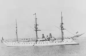 In 1893, Duguay-Trouin was sent abroad again, this time to the Pacific station.[8] In August that year, one of the ship's 164.7 mm guns accidentally exploded during target practice while she was in Papeete, Tahiti. The shell that had been loaded into the gun exploded on the deck, and five men of the gun crew were seriously injured, of whom four died, though several others received less serious injuries. The gun was destroyed and Duguay-Trouin received significant damage from the explosion; parts of the gun were thrown as far as 76 m (250 ft).[26][27] In December 1894, Duguay-Trouin visited Yokohama, Japan, and fired salutes to mark her visit.[28] The ship was transferred to French Indochina in 1895, where Bayard still served as the squadron flagship. The unit also included the protected cruisers Isly and Alger and the unprotected cruisers Forfait and Beautemps-Beaupré [29]