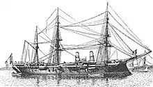 Her hull featured a pronounced ram bow that was reinforced to allow it to bear the impact of colliding with another ship, along with short fore and sterncastles.[4] The hull was constructed with steel frames and wrought iron plating, and below the waterline it was sheathed in a layer of timber and copper plate to protect it from biofouling on extended cruises. As was typical for French warships of the period, she had a pronounced tumblehome shape and an overhanging stern. Her superstructure was minimal, consisting primarily of a small conning tower forward.[5][6] Steering was controlled with a single rudder. Her crew consisted of 470 officers and enlisted men.[4]