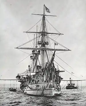 The Océan-class ironclads were designed by Henri Dupuy de Lôme as an improved version of the Provence-class ironclads. The ships were central battery ironclads with the armament concentrated amidships.[1] For the first time in a French ironclad three watertight iron bulkheads were fitted in the hull. Like most ironclads of their era they were equipped with a metal-reinforced ram.[2]