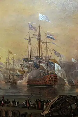 ![]() Victoire represented on a painting of the naval review of 1777 in Toulon. She is incorrectly depicted as a three-decker; Victoire was actually a 74-gun, with two batteries. | |