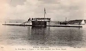 The boats were armed with four internal 450-millimeter (17.7 in) torpedo tubes, two in the bow and two in the stern, for which they carried six torpedoes.[4] Topaze and her sister Turquoise were the first French submarines to be equipped with a deck gun when they were fitted with a single 37-millimeter (1.5 in) gun in August 1915.[1]