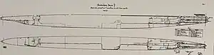 The single-hulled submarine Y had an overall length of 44.9 m (147 ft 4 in), a beam of 3 metres (9 ft 10 in) and a draught of 2.75 metres (9 ft 0 in).[2] The boat had a surfaced displacement of 213 long tons (216 t) and a submerged displacement of 226 long tons (230 t). She had a complement of 15 men.[3] Her armament comprised two superimposed 450-millimetre (17.7 in) torpedo tubes in the bow, two external 450 mm Drzewiecki drop collar torpedo launchers and one external 450 mm cradle aft.[1]