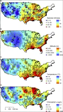 Geographical distribution of phytoplankton species richness across the continental United States: (A) phytoplankton species richness, (B) altitude, (C) annual mean water temperature, (D) annual mean chlorophyll a concentration