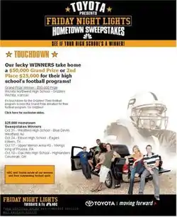 - ↑ "NBC, Toyota Pair to Draw Teens to Friday Night Lights". Chief Marketer. September 22, 2006. Retrieved April 13, 2007.