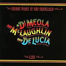 Friday Night in San Francisco is a 1981 live album by Al Di Meola, John McLaughlin and Paco de Lucía. It was described by jazz author and critic Walter Kolosky as "a musical event that could be compared to the Benny Goodman Band's performance at Carnegie Hall in 1938 ... [it] may be considered the most influential of all live acoustic guitar albums".[4]