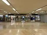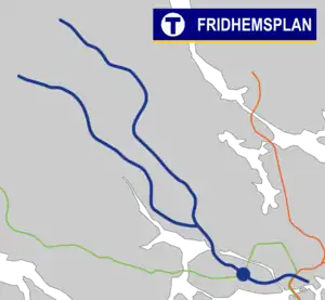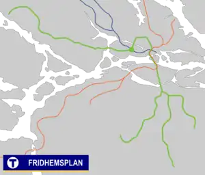 Fridhemsplan metro station is a station of the Stockholm metro, located in the district of Kungsholmen. The station is entirely underground and provides an interchange between the Blue and Green lines. There are two platforms for each line, about a hundred metres apart.