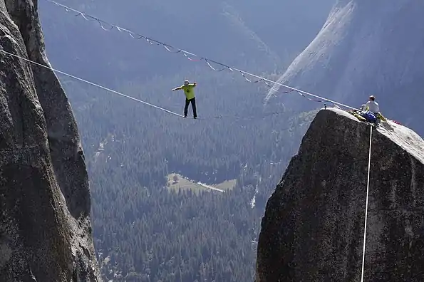 May 2015 Yosemite, USA First ascent of the longest highline across the Yosemite-Falls (110 meters)