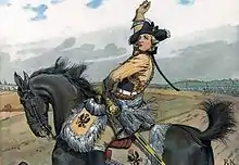Friedrich Wilhelm Freiherr von Seydlitz[Note 1] (3 February 1721 – 8 November 1773[1]) was a Prussian officer, lieutenant general, and among the greatest of the Prussian cavalry generals. He commanded one of the first Hussar squadrons of Frederick the Great's army and is credited with the development of the Prussian cavalry to its efficient level of performance in the Seven Years' War. His cavalryman father retired and then died while Seydlitz was still young. Subsequently, he was mentored by Margrave Frederick William of Brandenburg-Schwedt. Seydlitz's superb horsemanship and his recklessness combined to make him a stand-out subaltern, and he emerged as a redoubtable Rittmeister (cavalry captain) in the War of Austrian Succession (1740–1748) during the First and Second Silesian wars.