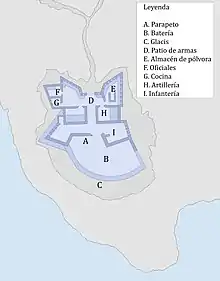 The fort was part of a series built along the coast which were built in sight of one another as a result of the loss of Gibraltar in 1704. The forts were there to protect shipping and to deter any invasion by a British fort from the enclave of the Rock.[1] This fort was at an important location as this is where the Bay of Gibraltar meets the rugged coast of the Strait of Gibraltar. This fort had a watchtower to enable signalling that was slightly higher on the 20 metre cliffs than the main battery. It was able to house twenty soldiers as well as an artillery officer, a sergeant and a corporal. In 1735 there were four guns and by 1796 there were five guns with two mortars. This was later extended to six 24 pounders.