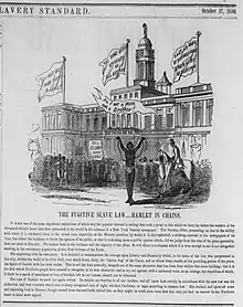 James Hamlet, the first man re-enslaved under the Fugitive Slave Law of 1850, in front of New York City Hall. The banner on the right reads: "A day, an hour, of virtuous liberty is worth an age of servitude".