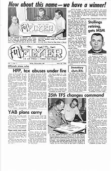 The first issue of Fuji Flyer was Vol. 1 No. 1, published on 26 June 1970 when it replaced Yokota's former paper the Afterburner. Staff Sergeant Sam Jones was the paper's first editor. The name change reflected the merger of the former Tachikawa Air Base paper Kanto Plainsman with The Afterburner. Through Dec 1997 Fuji Flyer was a black and white command-sponsored Air Force publication that contained no advertisements and ranged from 8 to 12 pages per issue. In January 1998 the paper, while still an official publication, was turned over to a private company that began printing the cover in color and supported its effort through advertising.