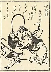 In Japan, Fukurokuju (福禄寿; from Japanese fuku, "happiness"; roku, "wealth"; and ju, "longevity") is one of the Seven Lucky Gods in Japanese mythology.[1] It has been theorized that he is a Japanese assimilation of the Chinese Three Star Gods (Fu Lu Shou) embodied in one deity. Most related in appearance to the Chinese star god Shou, he is the God of wisdom and longevity.[2] According to some, before attaining divinity, he was a Chinese hermit of the Song dynasty and a reincarnation of the Taoist Deity, Xuantian Shangdi. It is said that during his human incarnation, he was a sennin; a immortal who could exist without eating food.