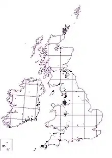 Fumaria purpurea has only been recorded in Britain, Ireland, the Isle of Man and the Channel Isles (an area sometimes referred to by naturalists as the British Isles), which makes it endemic to this area. It has a striking and unusual distribution pattern, being found in Britain mainly along a vertical line from Devon to Orkney. It grows in hedges and on disturbed ground, including gardens, arable fields and construction sites.[5][3] It was first collected in 1726 by Johann Jacob Dillenius, "ad sepes prope Shrewsbury" (in hedges near Shrewsbury, where it still occurs), according to a specimen at Oxford University (OXF)[6] which was identified much later by Pugsley.[7] In Britain and Ireland it is classed as "least concern" by the JNCC and the National Parks and Wildlife Service, respectively, while it is also listed as "vulnerable" in England and "critically endangered" in Wales.[8][9]