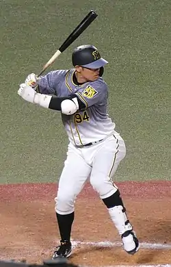 He alternated as a catcher and first baseman in the following week, while his continued success at the plate eventually led him to bat clean-up in some games. He even notched a walk-off hit in the May 19 game against the Dragons.[14] At the end of May, he was awarded the Central League MVP of the month for recording a batting average of 0.380, and hitting 17 RBIs including 5 home runs. He became the first Ikusei contract player in Japanese baseball history to get this award, and the 1st Hanshin catcher in 41 years to do so.[15]