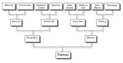 Furioso was sired by the English Thoroughbred stallion Precipitation (1933 – 1957), an influential sire who is found in the pedigrees of many racehorses and sport horses today. He was responsible for helping maintain the Matchem (1748 – 1781) and Godolphin Arabian sireline.