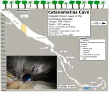 The Furnia de Catanamatias, also known as El Respiradero del Diablo, is the deepest cave in Dominican Republic, located near Las Matas de Farfán, San Juan, in the Sierra de Neiba mountain range. The cave was discovered in 1988 by a group of Italian cavers who wrote that they explored it to a depth of 380 meters.[1][2] A later expedition in 2023 by cavers from USA, Mexico and Costa Rica explored the cave down to 195m and stopped due to unbreathable air with high CO2 level.[3] The cave floods significantly during the wet season, and as a result the passages are often muddy, featureless, filled with mud and decomposing organic matter, which causes dangers such as unbreathable air and leptospirosis. Future expeditions to Catanamatias will need failproof respirator technology to continue exploration into regions of the cave with unbreathable air. [4]