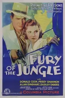 Fury of the Jungle is a 1933 American adventure film directed by Roy William Neill and starring Donald Cook, Peggy Shannon and Alan Dinehart. It was co-written by Dore Schary from a story by Horace McCoy.