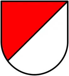The blazon of the municipal coat of arms is Per bend sinister Gules and Argent.[5]