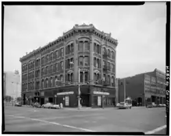The G. W. & W. M. Clayton Building, also known as the Granite Hotel, Granite Building and the Clayton Building, is an 1882 commercial building in Denver, Colorado and is a Denver Landmark. It is a four-story building which was built in 1882 on the site of the first building in Denver, a log cabin.[2] It was built to host the M.J. McNamara Dry Goods Company. G. W. & W. M. Clayton is inscribed near the top of the building for businessman George W. Clayton and his brother William M. Clayton, who served as mayor of Denver. The Denver Public Library has a photograph of the G. W. & W. M. Clayton Building.[3]