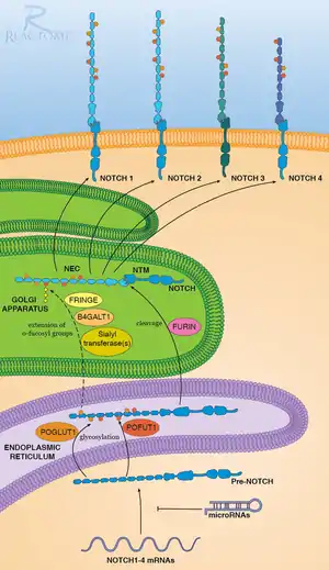 - ↑ Stahl M, Uemura K, Ge C, Shi S, Tashima Y, Stanley P (May 2008). "Roles of Pofut1 and O-fucose in mammalian Notch signaling". The Journal of Biological Chemistry. 283 (20): 13638–51. doi:10.1074/jbc.M802027200. PMC 2376238. PMID 18347015.