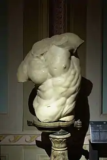 Formerly considered to be the torso of a satyr[4] when it was in the Gaddi collection, Florence,[5] the sculpture is now thought to represent a centaur straining against his bonds, a theme that was represented several times in Hellenistic art, as it was an emblem of civilized control of Man's baser nature.[6] The torso was very likely discovered in Rome, according to Giovanni Di Pasquale and Fabrizio Paolucci.[7] It was certainly already in the collections of the Florentine Gaddi family in the early 16th century, when Florentine artists and sculptors knew it. The sculpture appears on a pedestal, among other vestiges of shattered Classical pagan culture, in the Adoration of the Shepherds that was painted in 1515 by the Bolognese painter Amico Aspertini, now in the Uffizi.[8] Rosso Fiorentino's Deposition of the Dead Christ (Boston Museum of Fine Arts) has been inspired by careful study of the Gaddi Torso.[8] Its powerful, reaching and twisting musculature was a stimulus also to the young Michelangelo, whose mature style the Gaddi Torso seems to anticipate.[8] The Gaddi Torso remained with the Gaddi heirs until it was sold, still in its untouched fragmentary condition, to Leopold I, Grand Duke of Tuscany in 1778.[9]