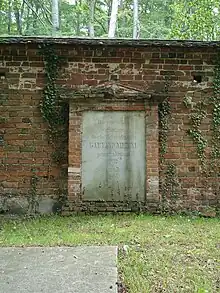 Medini, who later became Gustav Medini, was a member of the Freimaurerloge St. Andreas.[1] He was buried on the site of the Doberan Abbey at the eastern wall.[2] The stone slab, which is surrounded by bricks, is crowned by the remains of a classic gable.