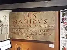 Classicianus died in London in 65. London had been destroyed by Boudica only four years before, so Classicianus must have overseen considerable reconstruction. His funerary monument was erected by his wife Julia Pacata, daughter of Julius Indus, a nobleman of the Gaulish Treveri who became commander of the Ala Gallorum Indiana cavalry unit.[3] The stone was re-used in the medieval wall of London, and, reconstructed, is now in the British Museum.[4]