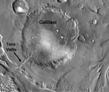 Tana Vallis is 60 km (37 miles) long and begins at the southwest rim of Galilaei Crater. Tana was eroded by the catastrophic drainage of a lake that formerly filled the crater, overtopped its rim, and rapidly eroded a breach channel through which the lake in Galilaei Crater drained. Terrestrial dam breach methods were used to estimate paleo-discharges in Tana Vallis.[8][7] Peak discharge rates in Tana Vallis would have depended on how quickly the breach channel formed. If it fully formed in two to ten days, the discharge peak would have been in the range from 15 to 47 million cubic meters per second. A key erosion parameter, stream power, has also been evaluated for Tana Vallis. For a scenario where the breach formed in five days, the stream power per unit stream bed area at the time of peak discharge would have exceeded 350,000 watts per square meter.[7] Erosive power of this magnitude would have sufficed to erode basaltic bedrock. The impact-altered material in the rim of Galilaei Crater would have been more easily eroded than intact basalts, and therefore the breach channel would have formed relatively fast.