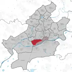 Location of the Gallus (red) and the Ortsbezirk Innenstadt I (light red) within Frankfurt am Main