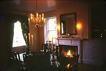 Dining Room at Galusha House during restoration, 1982, by candlelight, showing original Rumford fireplace.