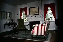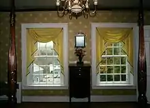 Forty handmade window sashes with 12-over-12 lights, based on one original in the house, were expertly handmade by restoration craftsman, Jerry Bates, and installed with brass runners. Reproduction historic wallpapers were used throughout, including Williamsburg patterns of the period in the front stairwell. Historically documented antique reproduction handmade lighting fixtures from Ball and Ball[27] in Pennsylvania were installed in the stairwell and other rooms. An entire new kitchen was installed, and the ceiling in the wooden ell at the back of the house was removed creating a cathedral ceilinged family room with loft. Bathrooms were completely replaced. Reproduction draperies from museum patterns were custom made for each room by historic fabric specialist, Lael Livak. Fine interior custom carpentry was by Sandy Packard. Plastering was done by Vermont's veteran master-plasterer, Willy Verchereau.(Restoration details are from flyer printed for house tour in 1982.)[28]