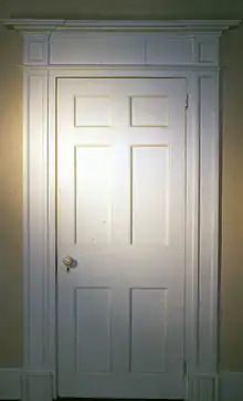 The front door is not original. It was originally topped by a classic fanlight and sidelights.[19] The small portico now above the door in front was added when the original door was sold during the 1930s, according to town legend.