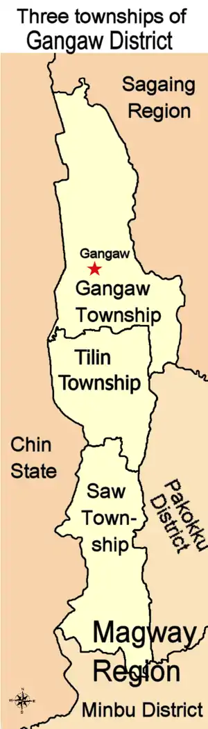 Gangaw District (Burmese: ဂန့်ဂေါ ခရိုင်, Burmese pronunciation: [ɡa̰ɰ̃ɡɔ́ kʰəjàiɰ̃]) is a district of the Magway Division in central Myanmar.