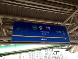 Gangmae Station is a railway station on the Gyeongui–Jungang Line. It closed July 2009 due to its proximity to Haengsin Station but was reconstructed and reopened on October 25, 2014 following the development of the surrounding area.
