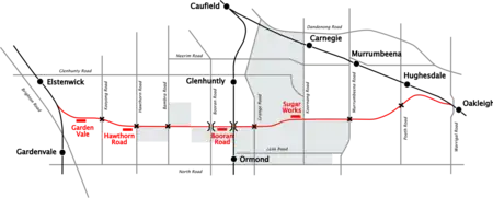 The new Gippsland line was originally planned to run from Elsternwick to Gippsland, using the existing M&HBUR line from Elsternwick to Melbourne. However, the M&HBUR wanted to charge an exorbitant fee for running rights over its tracks, and so eventually it was decided that the railway to Gippsland would link with a station to be built at Oakleigh.[1] While it might have been beneficial to join the Elsternwick and new Gippsland railways with Ross's cross-suburban line, its difficult negotiations with the M&HBUR made the Victorian government hesitant to allow another private railway, and Ross's scheme did not gain approval.