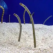 The garden eels are the subfamily Heterocongrinae in the conger eel family Congridae. The majority of the 36 known species of garden eels live in the Indo-Pacific, but can be found in warm ocean water worldwide.[1][2][3] These small eels live in burrows on the sea floor and get their name from the behavior of poking their heads from their burrows while most of their bodies remain hidden. Since they tend to live in groups, the many eel heads "growing" from the sea floor resemble the plants in a garden. They vary in color and size depending on the species. The largest species reaches about 120 cm (47 in) in length, but most species do not surpass 60 cm (24 in).[1][2] Garden eel colonies can grow as large as one acre in surface area and number up to several thousand individuals.[4][5]
