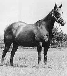 Garrett's Miss Pawhuska was a 1946 sorrel mare sired by Leo and out of Jenny Dee, a daughter of Jimmie Allred.[2] Her dam (mother) was out of a mare named Big Bay, who was of unknown breeding. Jimmie Allred was sired by Dan whose father was Old Joe Bailey. Jimmie Allred's dam was Alice McGill who was sired by Little Hickory Bill, a son of Hickory Bill who was sired by Peter McCue[3] Garrett's Miss Pawhuska was bred by Bill Rowe of Carlsbad, New Mexico, but by the time she was a yearling she was owned by Earl Jackson, of Pawhuska, Oklahoma. It isn't clear if Jackson bought Garrett's Miss Pawhuska as a foal or if he bought Garrett's Miss Pawhuska's dam while she was still carrying Garrett's Miss Pawhuska.[2]
