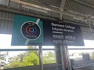 Garware College is an elevated metro station on the East-West corridor of the Aqua Line of Pune Metro in Pune, India. The station was opened on 6 March 2022 as an inauguration of Pune Metro and was the first to be completed.[1] From March 2022 to August 2023, the Aqua Line was operational between Vanaz and Garware College.[2] The extended section between Garware College to Ruby Hall Clinic was inaugurated on 1 August 2023. So the metro currently runs from Vanaz to Ruby Hall Clinic.[3]