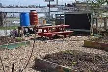 Founded in 2005, the Gateway Greening Urban Farm (GGUF) came about through collaboration between several St. Louis organizations and the awarding of a Community Food Project Grant from the United States Department of Agriculture Cooperative State Research, Education, and Extension Service (CSREES). At the time of its funding, the farm's mission was to “increase production and distribution of locally grown fresh food for low-income residents, increase self-sufficiency in populations experiencing addictions, mental illness, and homelessness, and provide neighborhood based nutrition and food preparation programs.”[34] While the initial plan was to establish the farm in stages over a period of 3 years, beginning with just 10 raised beds, the increasing demand for services and a timely donation of soil allowed the farm to rapidly expand physically and programmatically within the first year.[35] Today, the farm includes 48 raised vegetable beds, drip irrigation, native plantings, a rain garden, a dwarf fruit tree orchard, ornamental shrub borders, a rainwater catch cistern, a sheltered outdoor classroom, harvest station, composting bins, beehives and more.[32][36][37]