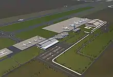 The airport consists of two public terminals at the airport, one for international traffic and one for domestic traffic. During the upgrade to an international airport, but before the opening of it, the Ministry of Culture, Tourism and Civil Aviation announced to build a new 35,000m² international terminal for the airport. The current terminal would be used as domestic terminal afterwards.[36] The Government of Nepal sought suggestions on different designs for terminals of Gautam Buddha International Airport through social media.[37] The new terminal would have 4 Sky-bridges, which the current terminal is lacking.[34]