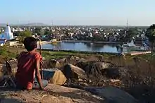 Gaya (IAST: Gayā) is a city, municipal corporation and the administrative headquarters of Gaya district and Magadh division of the Indian state of Bihar. Gaya is 116 kilometres (72 mi) south of Patna and is the state's second-largest city, with a population of 470,839. The city is surrounded on three sides by small, rocky hills (Mangla-Gauri, Shringa-Sthan, Ram-Shila, and Brahmayoni), with the Phalgu River on its eastern side.
