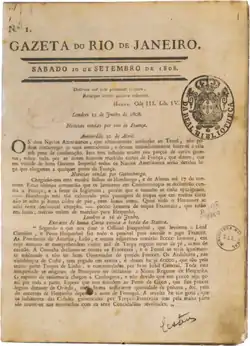 Gazeta do Rio de Janeiro was the first newspaper to be published in Brazil.[1] It was printed twice a week. It was pro government for the then Portuguese rulers of Brazil. Its editor was Friar José Tiburcio Rocha. It was renamed Gazeta in 1821 and shutdown after Brazil got Independence.[2][3][4][5]