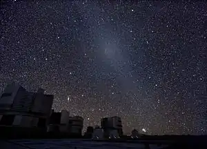 Gegenschein is distinguished from zodiacal light by its high angle of reflection of the incident sunlight on the dust particles. It forms a slightly brighter elliptical spot of 8–10° across directly opposite the Sun within the dimmer band of zodiacal light and zodiac constellation.[2] The intensity of the gegenschein is relatively enhanced because each dust particle is seen at full phase,[3] having a difficult to measure apparent magnitude of +5 to +6, with a very low surface brightness in the +10 to +12 magnitude range.[4]