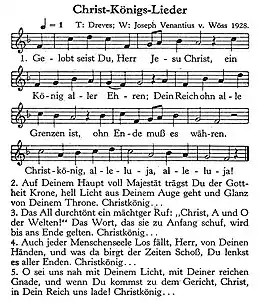 "Gelobt seist du, Herr Jesu Christ" (Praised be you, Lord Jesus Christ) is a Catholic hymn, addressing Jesus as the King. The five stanzas, composed in 1886, was written by the German Jesuit and hymnologist Guido Maria Dreves, and the melody was composed in 1928, three years after the introduction of the Feast of Christ the King, by the Austrian church musician Josef Venantius von Wöss.