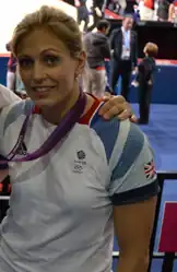 Kate Howey, Performance Development Squad Coach for 2012 stated that Gibbons "is one of our best medal hopes for judo" in the 2012 London Olympic and Paralympic Games.[11] In 2012 and ranked 42nd in the world at the time, at the 2012 London Olympics Gibbons won the silver medal, losing to Kayla Harrison in the -78 kg event.[12] Television coverage of the Olympics showed footage of a teary-eyed Gibbons looking upwards and mouthing "I love you mum" after winning her semifinal match, thus guaranteeing a medal. Gibbons had lost her mother to leukaemia years earlier. The moment became an iconic image of the Games, featuring by the media in several compilations and montages connected with the event.[13]