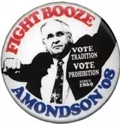 In 2003, Amondson was approached by Thompson Township, Pennsylvania tax assessor James Hedges, the Prohibition Party's only elected official. He convinced Amondson to seek the nomination of his faction of the Prohibition Party, which split over perennial presidential nominee Earl Dodge's leadership of the party. Hedges' faction felt Dodge was more concerned with his campaign button business than advancing the party's goals. Dodge had run as the party's nominee in every election since 1984, but received only 208 votes in the 2000 election, down approximately 1,000 from the 1996 election.[11] Amondson commenced his first presidential campaign with the nomination of Hedges' faction. Dodge received the other faction's nomination. According to Dodge, Amondson had previously contacted him about the vice presidential nomination, but it had already been filled. Dodge reasoned Amondson was "probably a very nice man ... [but] he may not have known exactly what he was getting into."[11] Conversely, Amondson referred to Dodge as a "good man" with whom he shared the same message,[18] but argued, "Dodge is just not getting the job done. He's too old. We need to send it to an earlier generation."[11]
