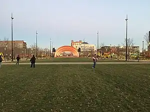 Gene Leahy Mall, also known locally as Central Park or The Mall, is a 9.6-acre (39,000 m2) park located at 1302 Farnam on the Mall in Downtown Omaha, Nebraska, U.S.A., and bordered by South 10th Street. There are also two huge slides, a sculpture garden, a remote-control boat cove, a large children's play area, and an amphitheater where outdoor concerts are held in the summer. The mall is decorated with thousands of lights during the winter holiday season.[1][2] Connected on its eastern edge with the Heartland of America Park, it is also borders the former site of the W. Dale Clark Library (demolished in fall 2022), the former Burlington Headquarters Building, the Old Market and the ConAgra campus.