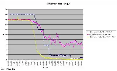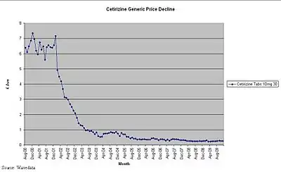 Generic pharmaceutical price decay is what happens (in the UK) once the originator brand has lost its patent exclusivity (patent expiry) and generic versions of the originator brand have been launched.[1][2][3][4][5][6]