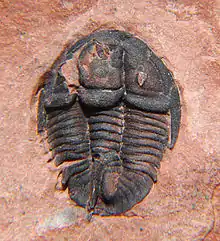 Genevievella is a genus of trilobites with a short inverted egg-shaped outline, a wide headshield, small eyes, and long genal spines. The backrim of the headshield is inflated and overhangs the first of the 9 thorax segments. The 8th thorax segment from the front bears a backward directed spine that reaches beyond the back end of the exoskeleton. It has an almost oval tailshield with 5 pairs of pleural furrows. It lived during the Upper Cambrian in what are today Canada and the United States.[2]